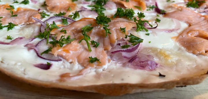 mit Räucherlachs und roten Zwiebeln, dazu Salat