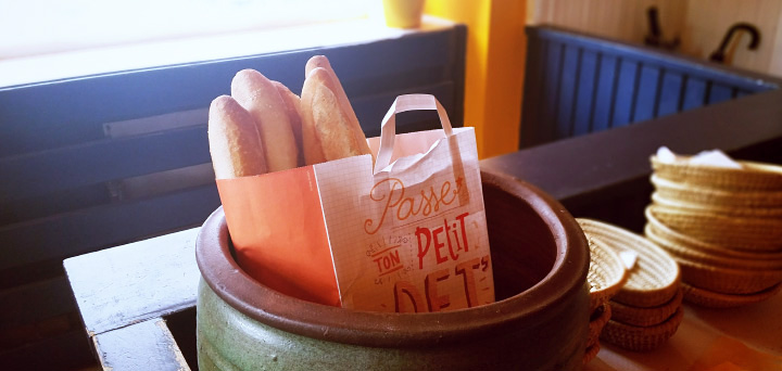 Französiches Frühstück: Baguette, Butter, Marmelade, Café au Lait